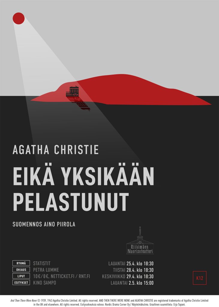 Agatha Christien klassikkoromaaninsa (v. 1939) pohjalta näyttämölle sovittama (v. 1943) suljetun tilan jännitysnäytelmä aikuisten Statistit -ryhmän tulkitsemana.